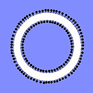 When soap is mixed into pure water, water molecules are attracted to the water-attracting end of the soap molecules. Water is also repelled by the oil-attracting end. This repulsion reduces the average attraction between water molecules in soapy water, thereby reducing the surface tension of the liquid. Imagine soap molecules as looking like a sphere at the end that attracts water and a small line at the other that repels water. The following drawing shows how adding soap to water allows for the creation of antibubbles:
