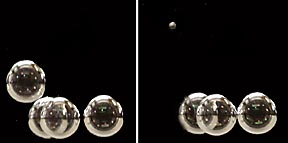 This images show the antibubbles seven times their actual size. The blurred bluish streaks behind them are remnants of burst antibubbles.