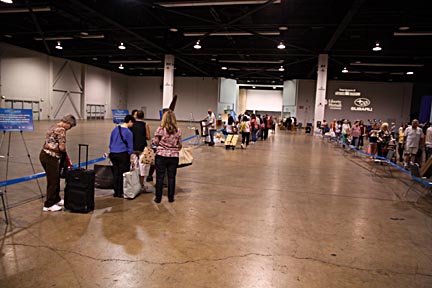 All the lines converge on a few narrow openings, each of which is controlled by more volunteers who pass people in one at a time as appraisers are available, cancelling each item ticket as they do so. While I acknowledge the necessity of crowd control, these narrow entrances to the appraisal area are painful choke points because so many people are in line to get in while at the same time people have to exit the appraisal area through the same narrow openings. Making things worse is people going in and out of the openings with dollies and carts that are too wide for the limited space. Not all venues are the same so some Antiques Roadshows may have more convenient, wider openings.