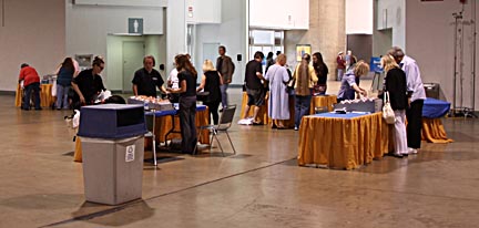 We entered the building at the lower right, where two volunteers (cyan dots) checked to make sure we had tickets. We were then directed through a passageway into an immense open building large enough to house two football fields. A second volunteer gave us two program guides...