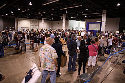 ...and directed us to go to the end of the magenta line, which had 800 people slowly shuffling along. Anyone arriving at the Antiques Roadshow more than 30 minutes before the time on their tickets were asked to wait in a holding line (blue) until their time was due.