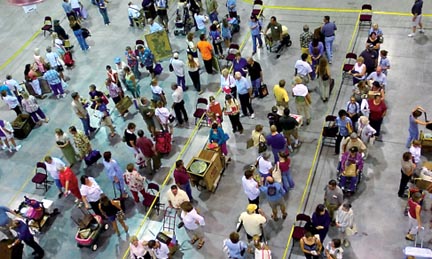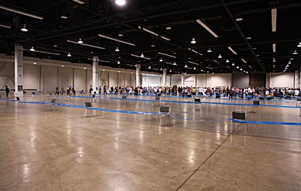 An aerial view of the actual Antiques Roadshow appraisal area during one of the few moments when the lines were short.