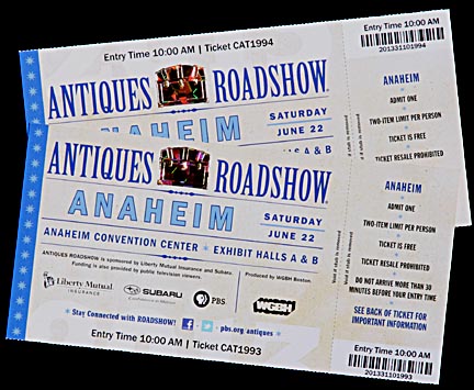 Each ticket admits one person, who can bring two items for appraisal. All the terms and conditions of attending are printed on the back in microscopically small lettering. Our tickets were for the Antiques Roadshow on 22 June, 2013, at the Anaheim Convention Center in Anaheim, southern California, right across the street from Disneyland.