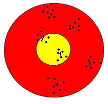 If your arrows aren't already numbered, do so and shoot at least six "ins" with them always shooting them in numerical order. Do this on a windless day and don't use any southern windage to correct for any eccentricities you may already know about. Aim all of the shots at the center of the gold. Each time you retrieve the arrows, place a dot in its location on a small copy of the target at which you're shooting. After six "ins," your small target will look something like this: