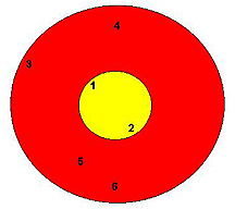 Next, decide on the center of each subgroup. Then take a very small, 1 to 2-inch diameter paper copy of a target, and place the numbers 1, 2, 3, 4, 5, and 6 on it in positions that are 180-degrees opposite from the corresponding arrow group's position and as far from the center as the group. Such a target based on the above groupings would look like this: