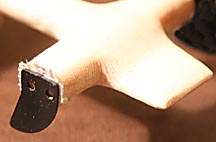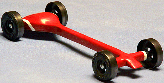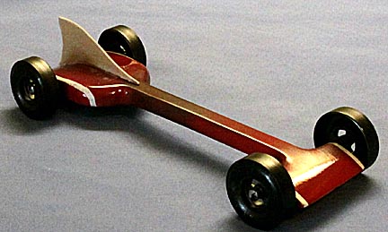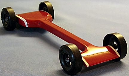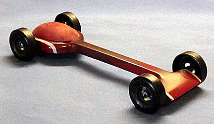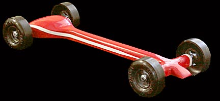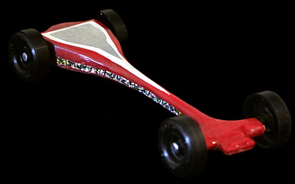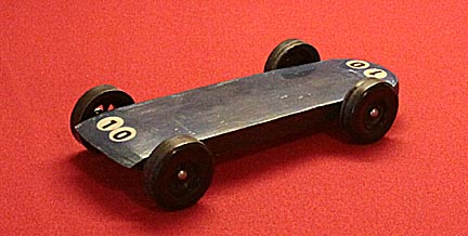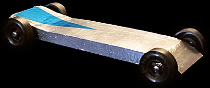 I found a pinewood block that had perfect grain so I decided to build what I hoped would be the best car ever. I succeeded, both by doing everything on this page and one new trick. Using digital calipers to measure the width of the block where the front and rear axle holes were to be drilled I discovered that the front was 0.003 inch narrower than the rear. This would have created and toe-in effect, similar to a skier snowplowing down a hill with his ski tips pointed inward. The car might have rolled perfectly straight but the plowing effect would increase drag. By placing a layer of scotch tape along the front, outside edges of the block I was assured that when the holes were drilled they would be more parallel. It's impossible to say if this was a major factor or not, but the car ended up blowing away every other car I've made. I rather like the paint design, too.