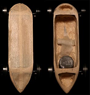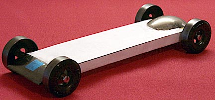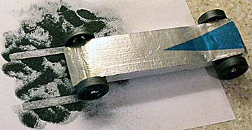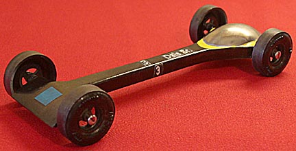 The design she chose was closer to ideal, with the exception of the fenders. In spite of the drag created by them, her car won every heat with room to spare. In the final race she led the second fastest car by a full car length. She wanted her car covered with glitter. This created the problem of specks falling off and fouling the track. The solution was to overcoat the glitter with a clear gloss spray. The name of her car was Princess Abby's Magic Carriage.