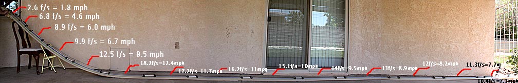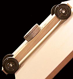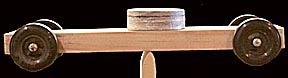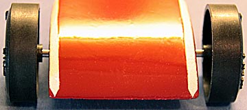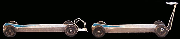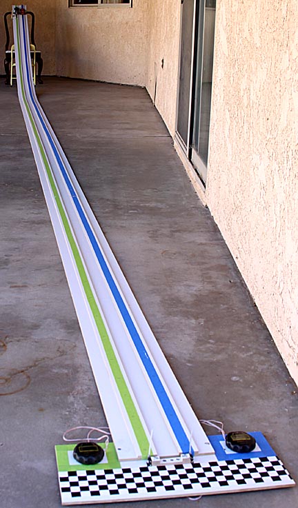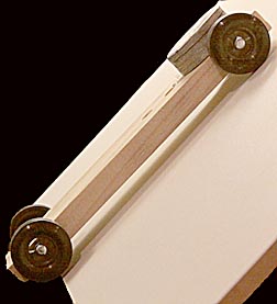 The times reported in the various tests on this page are for cars running on my track at home and are for comparison purposes only. If they appear slow that is because the vinyl surface on the track has a slight texturing that causes it to run slower than polished plywood tracks and much slower than aluminum tracks. Additionally, while most 32-foot tracks have actual run lengths of 30 feet or less, mine has a run distance of 31.1 feet. Finally, the start end of most tracks is 48 inches high. Mine is only 44. All these factors add up to a very slow track. For comparison, I made a car identical to one used by Dr. Acton for his DVD and discovered it ran 0.030 seconds slower on my track than on his. The conclusion is that if some of the times reported for what I consider a very fast car sound slow, it's because of the track.