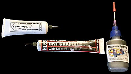 The first three graphites tested were: Hillman (graphite for locks), Hob-E-Lube (graphite and molybdenum mix) and Maximum-Velocity's Max-V-Lube (pure graphite.)