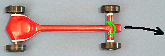 4. If you're aligning a three wheeled car, the point where the string attaches to the front of the car has to be positioned slightly toward the front dominant wheel. The reason is that the drag of this wheel is not balanced by the drag of the wheel on the opposite side. This one-sided drag induces a torque that will turn the car toward the dominant wheel. The amount of offset must be determined by measuring the weight on each wheel in contact with the track, assuming drag is a direct function of it and offset the attachment point proportionally to correct for it.