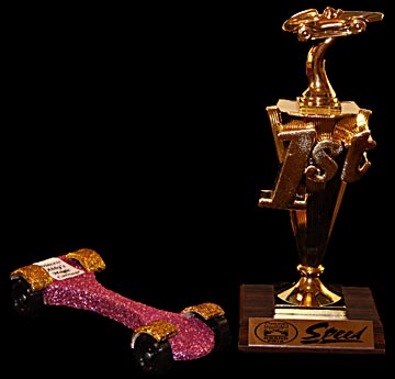 An important note is that while his car won every heat, in all fairness there were only two other high-performance cars in the competition: a silver, sword-shaped car that placed second in the boy's competition and an open-body design that won the girl's competition and came in second to Joshua's car in the combined, over-all winner races. In district or national level competitions his car would most likely be just an average competitor. On the other hand, in the second race Joshua's car had its front bumper broken off while colliding with a pile of bean bags used to stop the cars. This threw its balance off, reduced the car's weight and probably knocked off the front wheel alignment, all of which are speed killers. It would have been great to see how it would have done if it had been undamaged.