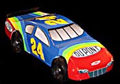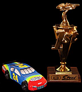 He's a great fan of Jeff Gordon, a NASCAR driver, and built his car to look like one of Jeff's early cars called the Rainbow Warrior. While the body shape is far from ideal, by hollowing out most of the inside, concentrating the weight near the back wheels, using the best wheels and axles possible, making sure the alignment was perfect and using lots of graphite this car managed to win 17 heats, tie one and lost just one to become his age group's grand champion. Although he defeated 29 other cars, most of the races were very close. This car did very well, though it wouldn't stand a chance against one with a better body shape.