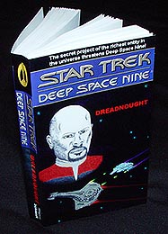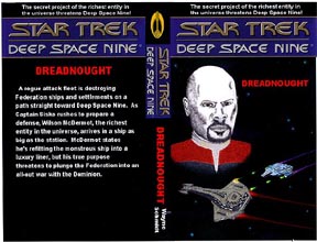 The actual cover is much sharper than this scanned image indicates. (I admit to being artistically-challenged, but when printed out this cover doesn't look too bad.) I scanned the "Star Trek - Deep Space Nine" titles from an actual paperback and sized them to fit the cover and spine. The short teasers at the top of the front and back, the long teaser on the back cover, title and author name placements shown in this example are in the standard format for paperbacks. I found it best to import the artwork into MS Word 97 and use WORD's text-addition software to add the teasers, novel titles, and author name. WORD is nice for this sort of work because it allows you to resize pictures without introducing digital interference patterns that can occur with some imaging software. Also, text is saved as an image file that can be resized and moved as a block to fit with the rest of the cover. Actually, this cover consists of several dozen small pieces, most of which are black lines and blocks to act as spacers between the picture and various titles. The height is fixed at the industry standard of 6 and 3/4 inches and the width is 4.25 inches. the thickness will vary depending on the thickness of your book. Dreadnought is 68,000 words long and requires a spine that's 11/16-inch wide. A longer book would required a wider spine. This is something that is determined after the book is printed. Once you've finished the cover, I recommend printing it on medium-weight glossy paper. Heavy-weight paper may sound better, but I've had problems with the emulsion cracking on the heavy-weight when folded to form the spine. Once the ink is dry, spraying it with a transparent photograph-protecting coating will prevent streaking and smudging. I use Sureguard, available from photographic supply stores.