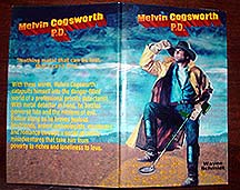 The image of Melvin was interesting to construct. I borrowed a picture from the cover of a western novel (giving the artist credit, of course) and used cloning in Adobe Photoshop to remove the gun in a holster he was wearing and a rifle in his hand. Then I had to add a left hand (it was hidden in the original by the rifle, and a left foot, which was off the lower border in the original. After that I placed him on a pile of gold coins. The trickiest part was putting a metal detector in his left hand. To do that I took a picture of an actual metal detector, used a trace select option to capture it, pasted it onto the picture, scaled it, then used the clone device to move his arm, which was under the pasted detector, to the area above it. All in all this cover took me 10 hours to make. Here's a sharper image of the front cover: