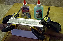 Once the novel is printed you can start gluing the spine. Begin by wrapping two short pieces of 1x2 wood in aluminum foil. Next, add three blank sheets of paper to the front and back of the book. These sheets usually get damaged during the gluing process so using blank sheets protects the printed sheets. Finally, clamp the book, making sure the pages are even, between the two pieces of wood and apply a thin layer of glue. (Use a flexible-when-dry glue. I found Elmer's sells several transparent glues like this in the stationary section of almost every grocery store.) Rub the glue into the paper to ensure that the edges of all of the pages get covered. Try to work the glue into the fibers of the pages. Let the book stand for an hour to let the glue dry. Add two more thin coats, letting it dry between each layer. The total drying time is less this way than trying to do it all in one thick layer.