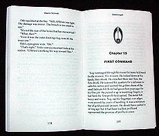 So, you've got your paper, the printer's warmed up, and you've got the formatting corrected. You're ready to print! Well... not quite. Look at a paperback and you'll see that there are several pages of front matter before the story begins. The first page is a teaser, one or two paragraphs from the book to capture the reader's interest. This is usually taken from a suspenseful passage. On the back of that page, at the bottom, is the publisher's name. I usually use the following statement in a bordered box: