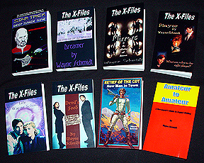 Above are samples of the eight books I've made. (For sharper images of what the covers look like, please go to my X-Files, DS9, or Retief pages.) Each of these covers consists of four parts: artwork, front title, rear page, and spine title. In the case of the X-Files books, Regina Payton, who owns the Vespers site, created dustcovers for the stories in my X-Files section. (Thank you Regina!) I was able to incorporate these into the covers to be printed. The artwork for the Retief of the CDT book came from a published book which I scanned and modified (Of course, I gave the original artist the coverart credit inside.), the Star Trek Deep Space Nine cover I drew from scratch (except for the Star Trek Deep Space Nine title block which I scanned from a published book), and the simple cover to Amateur to Amateur, my text on writing fan fiction, I made completely myself. Here's an example of a complete cover laid out flat: