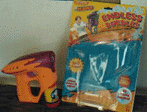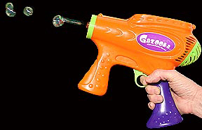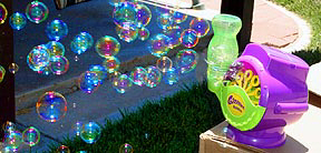 Walmart is selling a battery-powered bubble gun for $5.00. Although one of the three I bought didn't work, the other two produce a steady stream of bubbles. These guns can be temperamental but when they work, they really put out a lot of bubbles. They are also much neater than any of the other machines I've tried. They don't foam up and don't drool as much bubble solution. The optimized bubble mixture I discuss further down the page works much better than the solution provided with the guns.