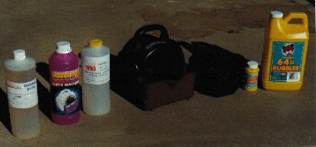 From left to right: Theatre Effects bubble juice (a bomb), Bubble-Pro bubble juice (okay), Visual Effects Inc. bubble juice (outstanding!), Bubble Pro machine (poor wand design), Visual Effects Mini-Bubbler (good), Unique bubble solution (okay), Imperial bubbles (so-so). Unfortunately, both bubble machines are flat black and impossible to get a get a good photo of.