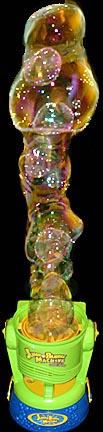The 12-inch tall bubble machine has many new and innovative features. First, and most importantly, it has a built-in fan that blows the bubbles straight up instead of forward. Because of this the bubbles remain in the air much longer. Second, it has a large base filled with bubble solution that not only provides enough bubble juice for up to an hour of continuous use, but acts as a heavy base to stabilize the bubble machine. All this goodness comes at a price. The bubbler has to be flushed with warm water after every use. If not, bubble solution could dry out and gum up the pump used to move the bubble solution from the reservoir to the bubble wands. As of Summer or 2006, this machine is very hard to find either on the west coast or even on the Internet.