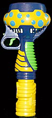 The Ghost Bubble machine by Peterfish toys worked better, but it too was disappointing in many ways. This bubbler has a small built-in smoke machine that's supposed to created smoke-filled bubbles by dipping the yellow bubble wand at the top in bubble solution, turning it upright, then pressing either the fast (top) or slow (lower) trigger on the left side to engage a fan to blow the bubbles. It works... but only after a fashion.