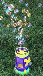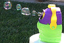 In June of 2008 I saw a TV commercial for Gazillion's Jumble bubble machine ($20 at Walmart.) Unlike the Typhoon, this machine uses a reciprocating half-circle to pull bubble solution up and over the fan to produce much larger bubbles. Better still, an inner, smaller half-circle blows smaller bubbles inside many of the larger ones.