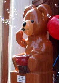 This is a three-foot tall, battery powered, automated bubble blowing bear that someone with a store can mount outside the door. The bear, which comes in several color schemes, the moving arm and drifting bubbles all attract people to it. Outside a toy store it would be particularly effective. Since the bubbles can drift for blocks it would be like having an arrow hundreds of feet long pointing toward the shop. It could be especially helpful to stores with small frontal exposure or those around a corner and off the main customer walkway. For more information about Streetbear and additional pictures of it click on the link http://www.streetbear.com (but please don't forget to come back and read the rest of my bubbles page.)