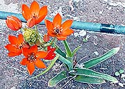 In November of 2004 I received an email from Mr. Aaron Schnebly who informed me that the mystery bulb is the rather rare Star of Bethlehem (ornithogalum dunium) from South Africa. Thanks, Aaron!