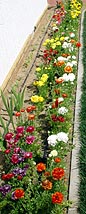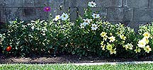 Here are some results from a planting of Mignon Border dahlias set out in spring of 2003. They bloomed for one month. These have tuberous roots that are the size of fingers. Six of the eight ordered grew. I discovered that when deadheading, I needed to cut the stem as far down as possible or the plant ended up looking like a porcupine. I also learned that these are tough little plants. I had to move them in the middle of summer and in spite of that shock they were flowering again by September. These dahlias easily get blown over in the wind so in the future I'll provide support in the form of shortened tomato cages. The plants should grow up around them and hide them.