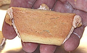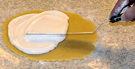 Apply a thin layer of frosting to a cookie, just enough to hold the nuts on top or the cookie will be too sweet. If that happens all of its rich and subtle flavor will be masked by the overpowering sweetness of the frosting.