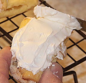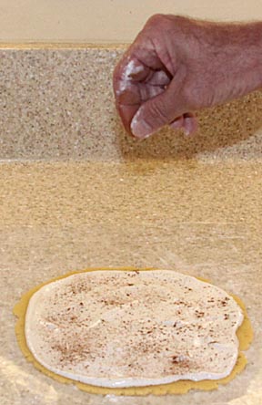 I find holding my hand high helps the fine cinnamon spread out better. Beware of trying this in a draft. Cinnamon is such a fine powder that it is easily carried away. This picture above shows the light coating of cinnamon that's all that's needed.