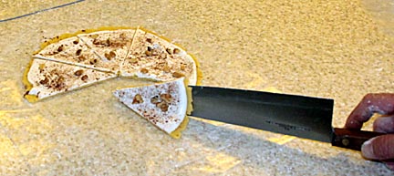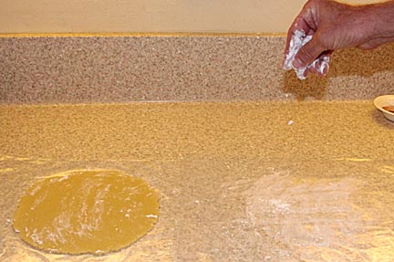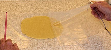 7. Cover the dough with the plastic and turn it over. Peel off and discard the new top layer of plastic. The dough now lays on a thin layer of flour that prevents it from sticking to the plastic. In a few steps you'll be cutting this dough into eight triangles and pulling them out of the circle. Without the flouring step the dough sticks to the plastic so tightly that it stretches and tears when you try to move it. I've tried rolling the dough out on a floured board. To keep it from sticking so much flour has to be used that the dough picks up too much and its baked texture suffers.