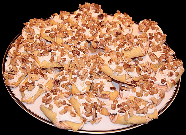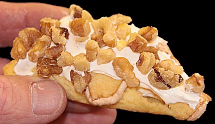 Butterhorns have a perfect balance of sweetness and richness combined with beautiful appearance and a unique, delicate texture. They are three-inch long crescents filled with delicately crisp meringue, covered in French vanilla frosting and walnuts and are more like fine pastry than a cookie.