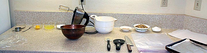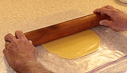 Start off by using a knife or scissors to separate the two sides of four, 2-gallon reclosable plastic bags. These are used to roll the dough out. While a single pair of sides could be used, the hassle of cleaning them off between each use is time consuming. Set these aside. Cover a heavy aluminum cookie sheet with two layers of paper towel topped with a sheet of non-stick aluminum foil. Repeat with a second cookie sheet. The paper slows the baking of the bottom of the cookies so they don't burn before the tops are done. If your cookie sheets are very clean and shiny, one sheet of paper may be enough. If they are old and stained, three may be needed. (This foil-over-paper technique is something that's useful for baking all sorts of cookies. It works much better than the air-bake type of cookie sheet and the number of layers of paper can be adjusted to suite particular cookies.)