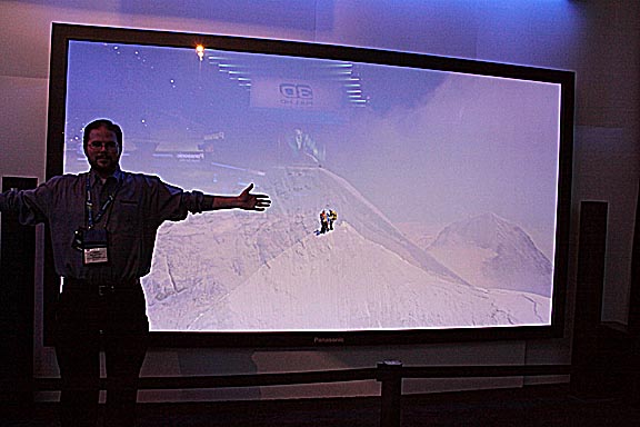 It appeared much larger in person than the photo above suggests. Image quality was outstanding with absolutely no pixelization even standing as close as five feet, thanks to its 4000x6000 pixel count. However, it featured a special ultra-high definition video specially made for the display. A regular DVD or even blu-ray movie would look jagged even after line quadrupling unless you were 20 feet away from it.