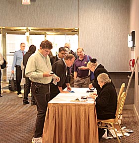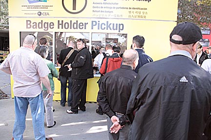 With the ticket you get instructions stating that before being let into the show you have to go through a check-in procedure where they check your driver's license, business card and ticket, which comes with a credit-card looking card that they swipe through a reader to bring up your file, and if everything checks out, hand you a rather dorky plastic card holder with a strap so it can be worn around your neck. The ticket/ID card goes into the card holder to identify you. The holders are color coded to correspond to particular categories: red for buyers, blue for industry associate, grey for engineer, black for exhibitor, maroon for press and so on. In addition to at least a dozen check-in windows at the Las Vegas Convention Center, there are many more located in most of the hotels in the area. However, these can only supply the more common holders. In my case they didn't have any for press.