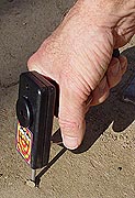 There are no ground balancing or sensitivity controls on the CP-100. All you do is pull the toggle trigger (visible on the bottom of the body in the second photo) and stick it in the ground. When the tip or sides of the tip come within 1/8th-inch of a non-ferrous object, the buzzer on the top of the body buzzes. The pinpointer is silent when the point is near or touching iron objects. But, the buzzer buzzes as the target goes past (again, after getting within 1/8th-inch of it) or when the probe is pulled away from it.
