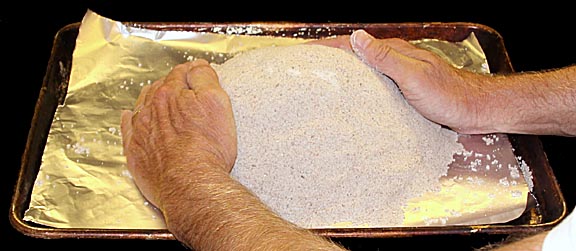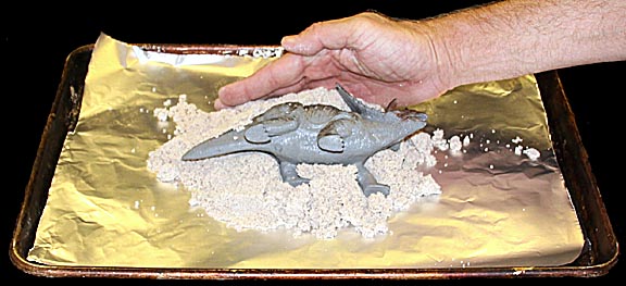 Place a couple of handfuls on a large sheet of aluminum foil and press down the object to be buried, in the following case a small plastic triceratops:
