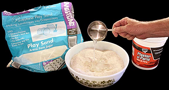 Mix the sand and plaster of Paris in a large bowl. Make sure the plaster is evenly mixed throughout the sand. Then add the water