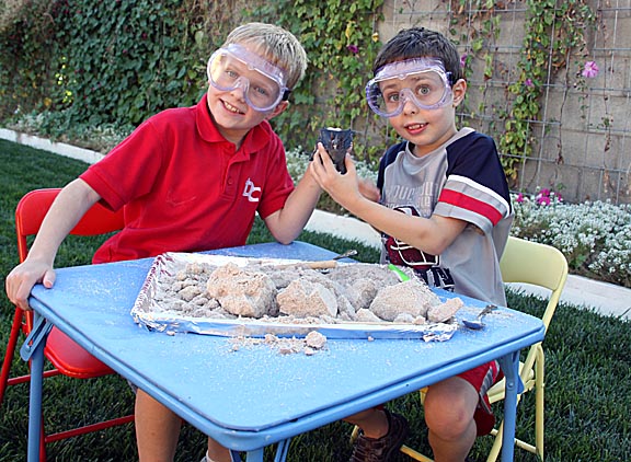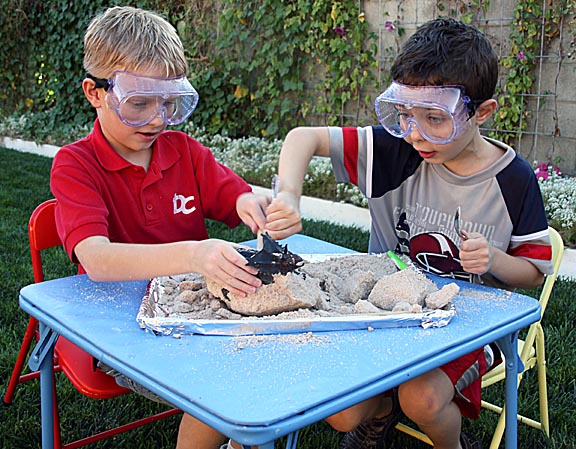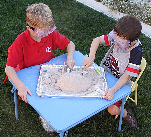 I tried having them use several different types of safe homemade wood tools but in the end plain old spoons worked the best. Very young children may have better luck with baby spoons. A couple of old tooth brushes are useful to have on hand for delicate work. An important word of warning: Always have children wear eye protection. As they brush and dig, sand inevitably flies and if any of it got into their eyes it could cause serious problems.