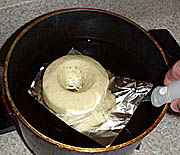 To increase the amount of raising I tried spritzing the doughnuts with warm water before placing them on the foil. The doughnuts rose higher, but when fried the surface often took on a wrinkled look. Also, sprayed doughnuts tended to spread into odd shapes.