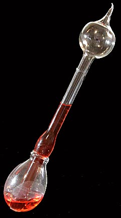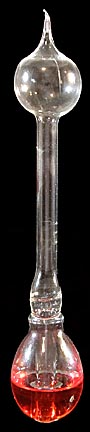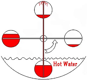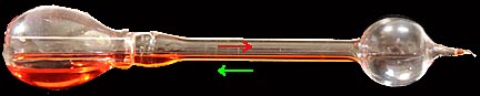 The leaning increases as more liquid goes up the tube until it reaches a critical point near horizontal where the end of the tube in the lower bulb raises above the surface of the liquid. When this happens warm gas from the bottom is pushed through the top of the tube into the upper bulb (red arrow) at the same time that liquid flows back into the bottom bulb (green arrow.) The reason this happens is that while the image above shows the tube horizontal, in fact this happens with the upper bulb slightly higher than the lower one. The gas, being lighter, wants to rise and the liquid, being heavier, drains downward.