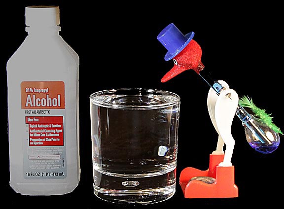 If 91-percent alcohol is used instead of water, its faster evaporation rate creates more cooling. A 15-second bird in water will take a drink every 8 seconds with alcohol.