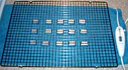 Since warming pads vary, it was necessary to experiment with each one to come up with a system that provided the desired temperature. In the picture above the pad's lowest temperature is a few degrees too high so the chocolate rests on a metal rack to lift it off the pad. Another pad I use has excellent temperature control but the heating wires are so far apart that one area will melt the chocolate while another leaves it too hard. The solution was to place a sheet of aluminum between the chocolate and the pad. Aluminum is an excellent heat conductor and evened the temperature variations so that chocolates placed on it are all the same temperature.