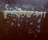 If you are viewing this page at a standard default of 72 ppi, then the clumps will display full size. The length of the clump along the water line is a little over two inches long, representing tens of thousands of eels that can be collected in a second using an eyedropper. The clumps are so dense that very little growing liquid is collected when the eels are drawn into the eyedropper so that you don't have to worry about adding too much acid to the fry tank.