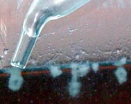 Hint #2: Even separated, drops of vinegar eels still tend to fall to the bottom of the tank because the els, and the medium they grow in, are heavier than water. This problem can be remedied if there is a horizontal surface just under the fry tank's water line. If there is, in my fry tank it's the top of the power head the circulates the water through the filter system, discharge most of the eels onto this surface. The eels will congregate there and stay near the surface. But... don't forget to scatter a few drops throughout the tank so that all the fry can find them.