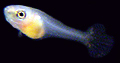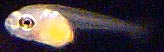 A picture of a one week old fry, much enlarged. The yellow area is a stomach full of baby brine shrimp. When fed vinegar eels, the stomach is silvery white.