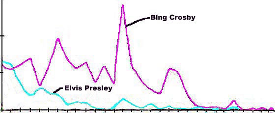 This chart shows how each artist's popularity fluctuated over his career. The vertical axis is the total popularity number per year. The horizontal axis is in years. Both profiles are to the same scale. Elvis' followed a very typical profile of an initial massive popular appeal followed by a gradual decline as newer artists took over. Bing Crosby's is unique among all performers in that he maintained an unprecedented high level of popularity over almost his entire career.