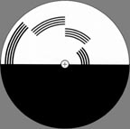 This disk is identical to the previous one except that the solid arcs have been divided into three fat lines. At 100 rpm clockwise, the center three arcs appear maroon and all the other arcs look dark blue. At 150 rpm the center turns more reddish, the next set of lines yellow-green, then gray green, then blue. At 600 rpm the center looks gray-violet, then dull, faint gray-red, gray-green and finally dark blue. The colors reverse order when the direction of rotation is changed. This is an excellent disk for showing the effect of speed on color density. At low rpms the colors appear solid and more saturated, but they flicker. At higher rpms the colors look washed out but appear to be continuous circles all the way around the disk.
