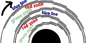 This last disc is the one used in Benham tops and is by far the most complex and also the most frustrating. It produces some of the brightest, clearest reds but the spiral-like pattern of the arcs makes them appear to be moving inward and outward so there is never one place you can focus on to study them. It's like looking at meteors. Just when you spot one, it's moved on to somewhere else. Clockwise rotation at 150 rpm produces two streaks of red moving apart inside each wedge shape defined by the fine lines. Underneath these red lines is a hint of green while outside is a line of very dark blue.